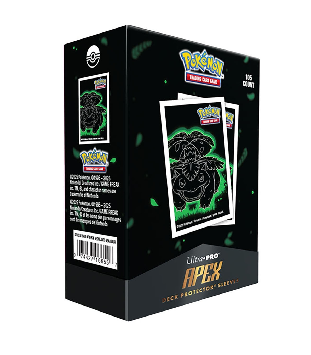 Fundas APEX Deck Protector® de Ultra Pro con diseño de Venusaur (105 uds). Fabricadas en polipropileno seguro para archivo, ideales para cartas de tamaño estándar (63,5 x 88 mm). Fórmula especial de fácil barajado y reverso texturizado con acabado artístico. Frontal transparente con brillo para destacar cartas foil. Producto para distribución y venta al por mayor.