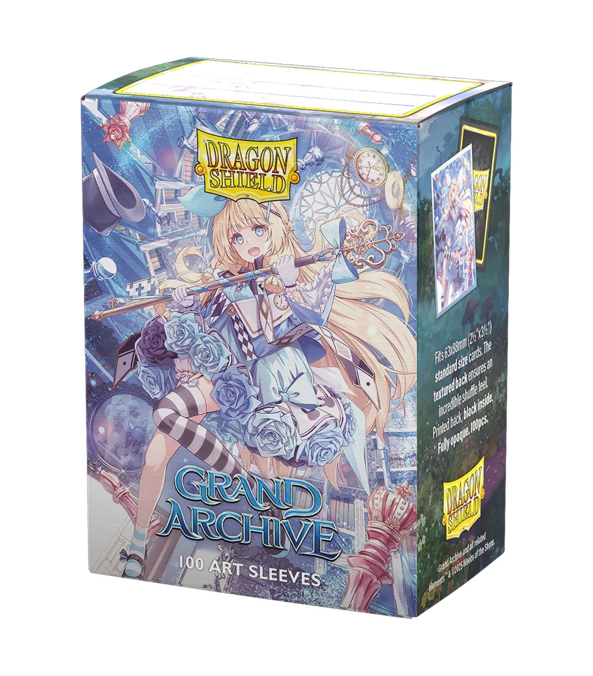 Fundas Grand Archive Alice Orleane – Dragon Shield (100 uds.). Diseño: Alice Orleane, la Reina Dorada. Compatibles con cartas estándar 63 × 88 mm (Magic, Pokémon, Lorcana, Grand Archive). Interior negro opaco, perfectamente dual. Arte impreso directamente en las fundas, resistente y sin posibilidad de descascarillado. Empaquetado en caja reutilizable de cartón con etiqueta personalizable. Distribución al por mayor y venta para tiendas especializadas.