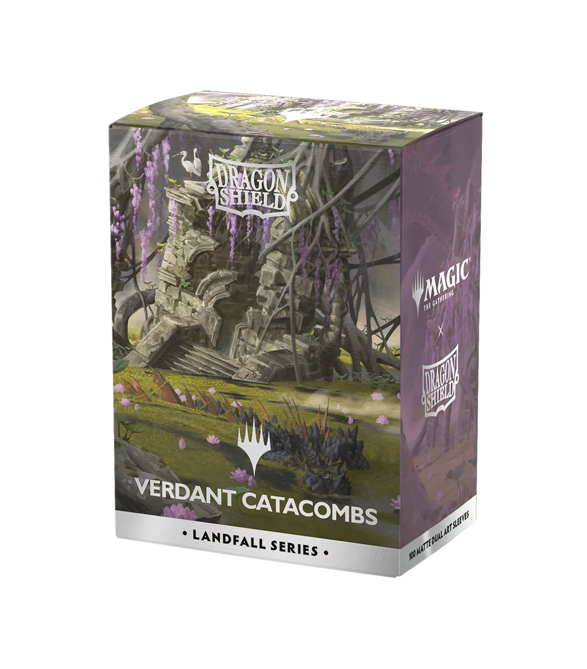 Caja de 100 fundas estándar (63 × 88 mm) compatibles con juegos de cartas como Magic: The Gathering™. Edición especial de la serie “Landfall Series”, que presenta la versión showcase de Verdant Catacombs con dragones. Acabado Matte Dual Art: interior negro opaco que enmarca tus cartas para una presentación refinada, con arte impreso de alta calidad en el reverso. Diseñado para venta al por mayor y distribución en tiendas especializadas en TCG.