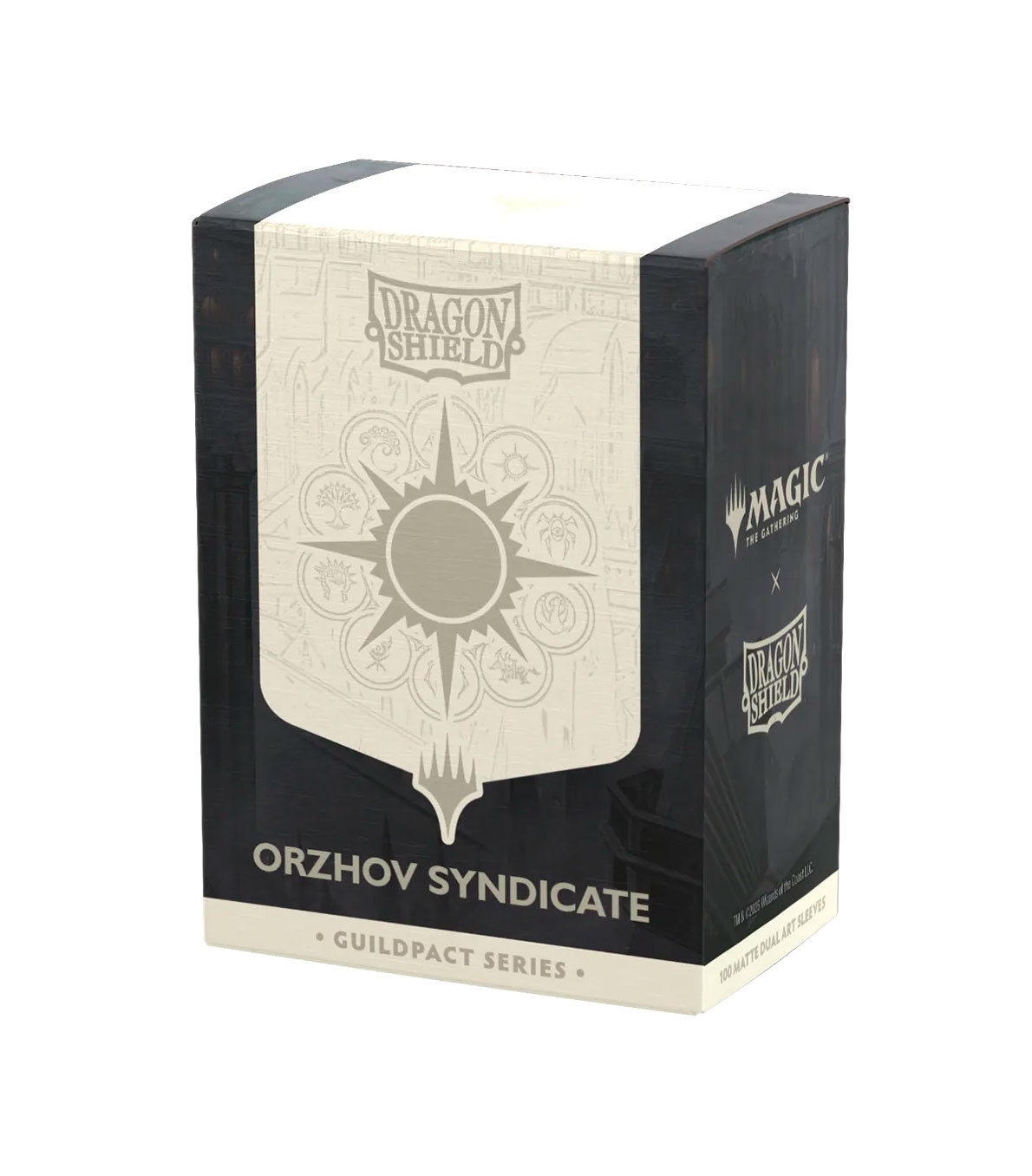 Fundas Dragon Shield Matte Dual Art Orzhov Syndicate (100 uds.). Compatibles con cartas estándar (hasta 63×88 mm). Diseño oficial de la guild Orzhov Syndicate con símbolo metálico y colores temáticos. Acabado Dual Matte para una mezcla ideal de estilo y funcionalidad. Distribución mayorista en caja reutilizable.