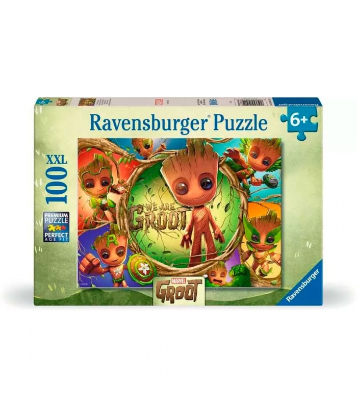 Puzzles Marvel Groot 100 pz XXL de Ravensburger. Vive la emoción de acompañar a Groot y otros héroes icónicos de Marvel en este vibrante rompecabezas de 100 piezas XXL. Este puzzle refleja la esencia del adorable y valiente Groot, perfecto para inspirar a los pequeños fans de Marvel. Fabricado con materiales de alta calidad, mide 49,3 x 36,2 cm al completarse y está diseñado para niños/as a partir de 6 años. Cumple con los estándares de seguridad de la UE, garantizando diversión y aprendizaje en cada pieza. Ravensburger combina entretenimiento y calidad en un imprescindible para los amantes de Groot.
