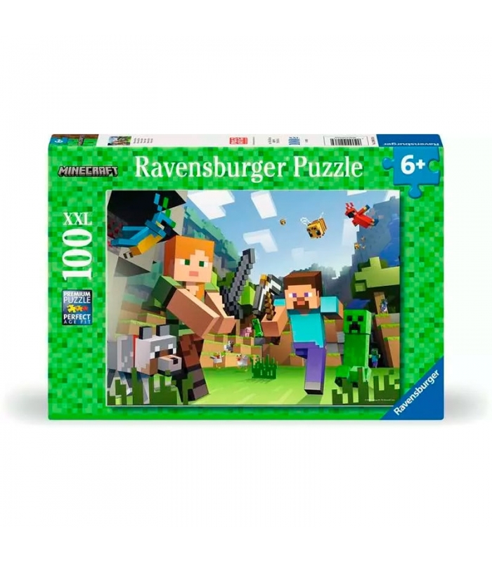 Puzzles Minecraft 100 pz XXL de Ravensburger. Basada en la famosa licencia Minecraft. Acompaña a Alex y Steve en una emocionante aventura por el bioma de las llanuras junto a su leal lobo, mientras un Creeper les acecha en secreto. Este vibrante rompecabezas de 100 piezas XXL es perfecto para fans de Minecraft. Con unas dimensiones de 49 x 36 cm una vez terminado, está fabricado con materiales de alta calidad que cumplen con los estándares de seguridad de la UE, garantizando diversión segura. Ideal para niños/as a partir de 6 años, este puzzle fomenta habilidades como la concentración y la creatividad. Ravensburger, líder mundial en puzzles, ofrece calidad y entretenimiento en cada pieza.