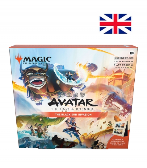 The Black Sun Invasion: Esta caja de escena de Magic: The Gathering Avatar: la leyenda de Aang, contiene 6 cartas de escena foil tradicionales sin borde, 6 cartas de escena solo con ilustraciones, 3 sobres de juego y un caballete de cartón. Cada sobre de juego contiene 14 cartas de Magic: The Gathering, con una combinación de entre 1 y 4 cartas raras o de una rareza superior, entre 3 y 5 poco comunes, entre 6 y 9 comunes y 1 carta de tierra. Una carta de cualquier rareza es foil tradicional. La carta de tierra también es foil tradicional en el 20 % de los sobres de juego.