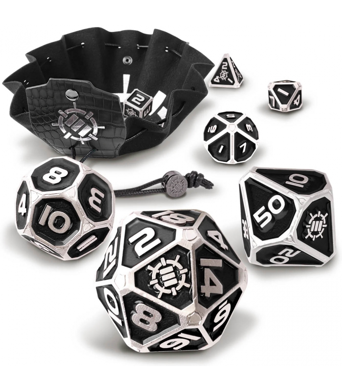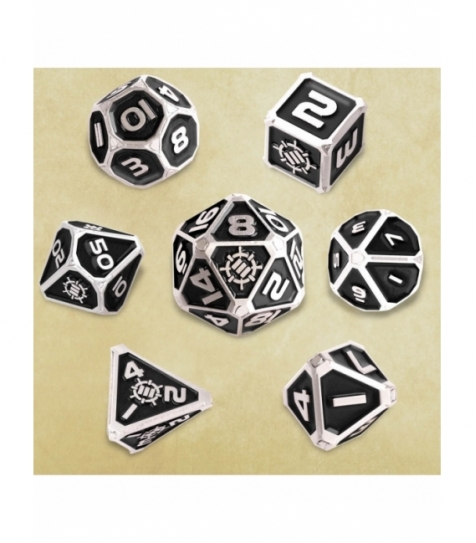 Edición Collector’s de dados metálicos 7 pcs preparada para rol: diseño pesado, números moldeados, acabado premium. Distribución dirigida a tiendas especializadas y venta al por mayor.