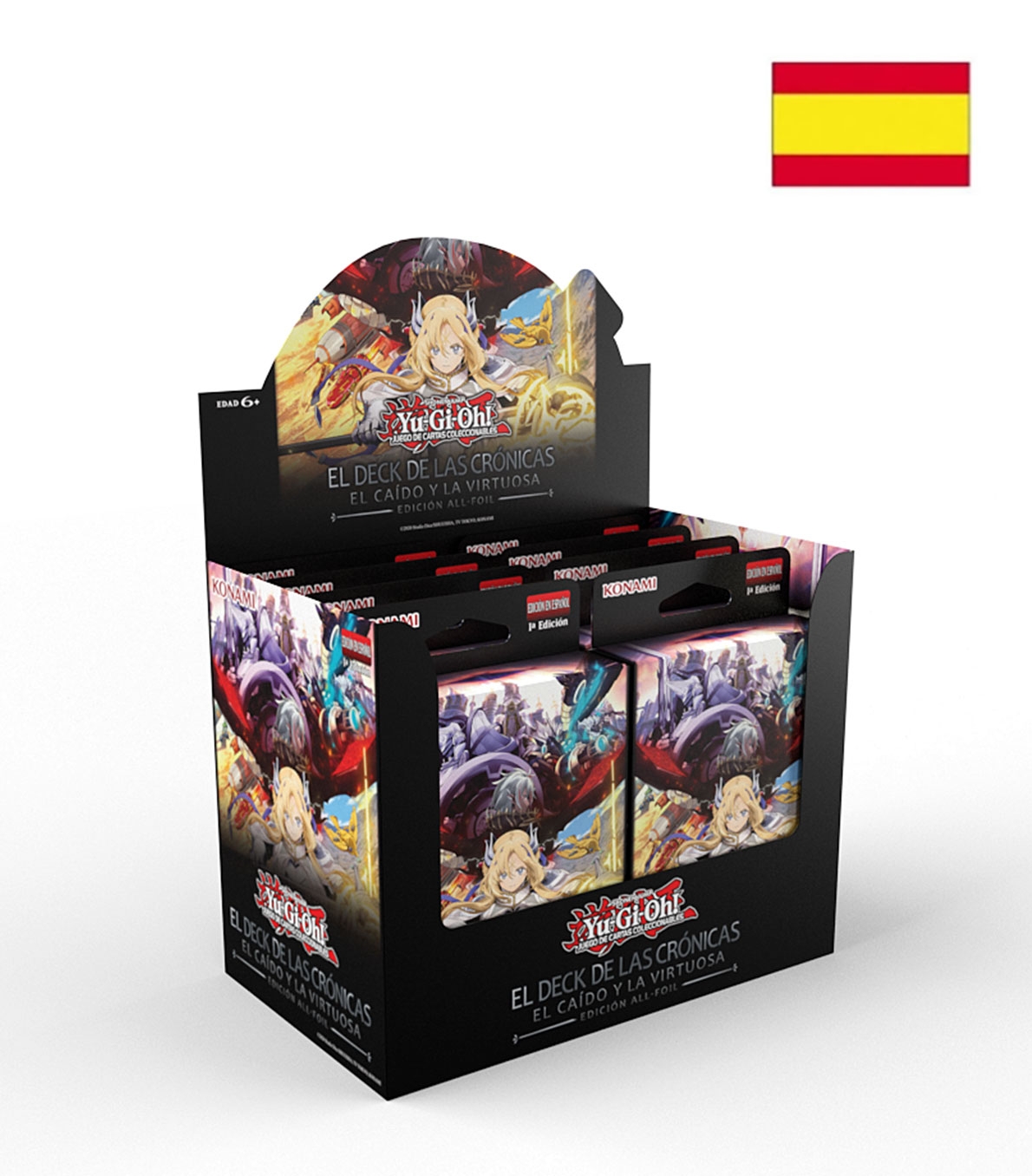 Structure Deck (8 Mazos) The Chronicles - The Fallen & The Virtuous Español - Yu-Gi-Oh! Caja con 8 mazos precocinados en español. Cada mazo contiene 51 cartas foil: 50 Ultra Raras + 1 Secreta Rara (con posibilidad de upgrade a Starlight Rare). Incluye 2 cartas nuevas y 4 cartas con arte alternativo. Basado en la serie animada The Chronicles: The Fallen & The Virtuous. Ideal para distribución mayorista y venta al por mayor en tiendas especializadas.