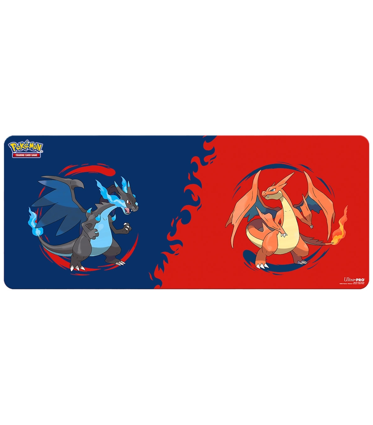 Tapete de mesa 6 pies para el juego de cartas coleccionables Pokémon. Presenta una ilustración vibrante a todo color de Mega Charizard X y Mega Charizard Y. Fabricado por Ultra PRO con superficie de tela suave para proteger tus cartas durante el juego y base antideslizante de goma para que el tapete permanezca firme en su lugar. Con unas dimensiones aproximadas de 72 × 30 pulgadas (≈ 183 × 76 cm), perfecto para mesas de juego amplias. Ideal para distribución y venta al por mayor en tiendas especializadas.