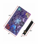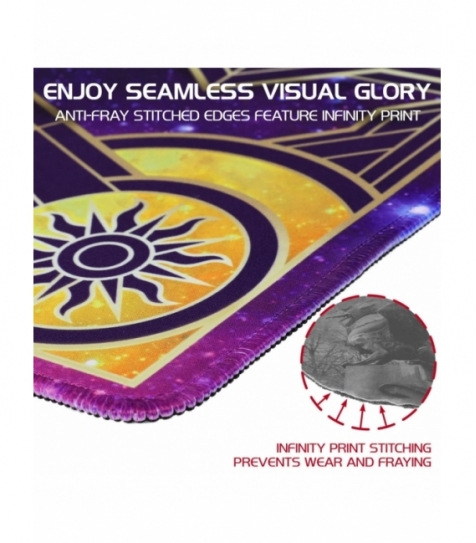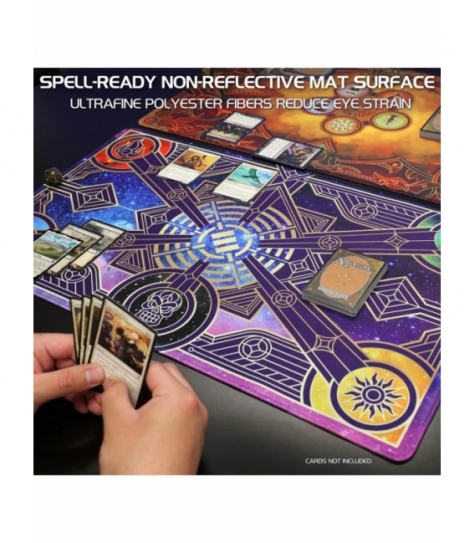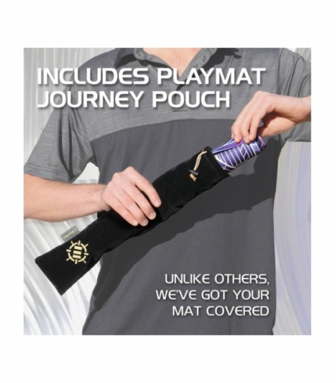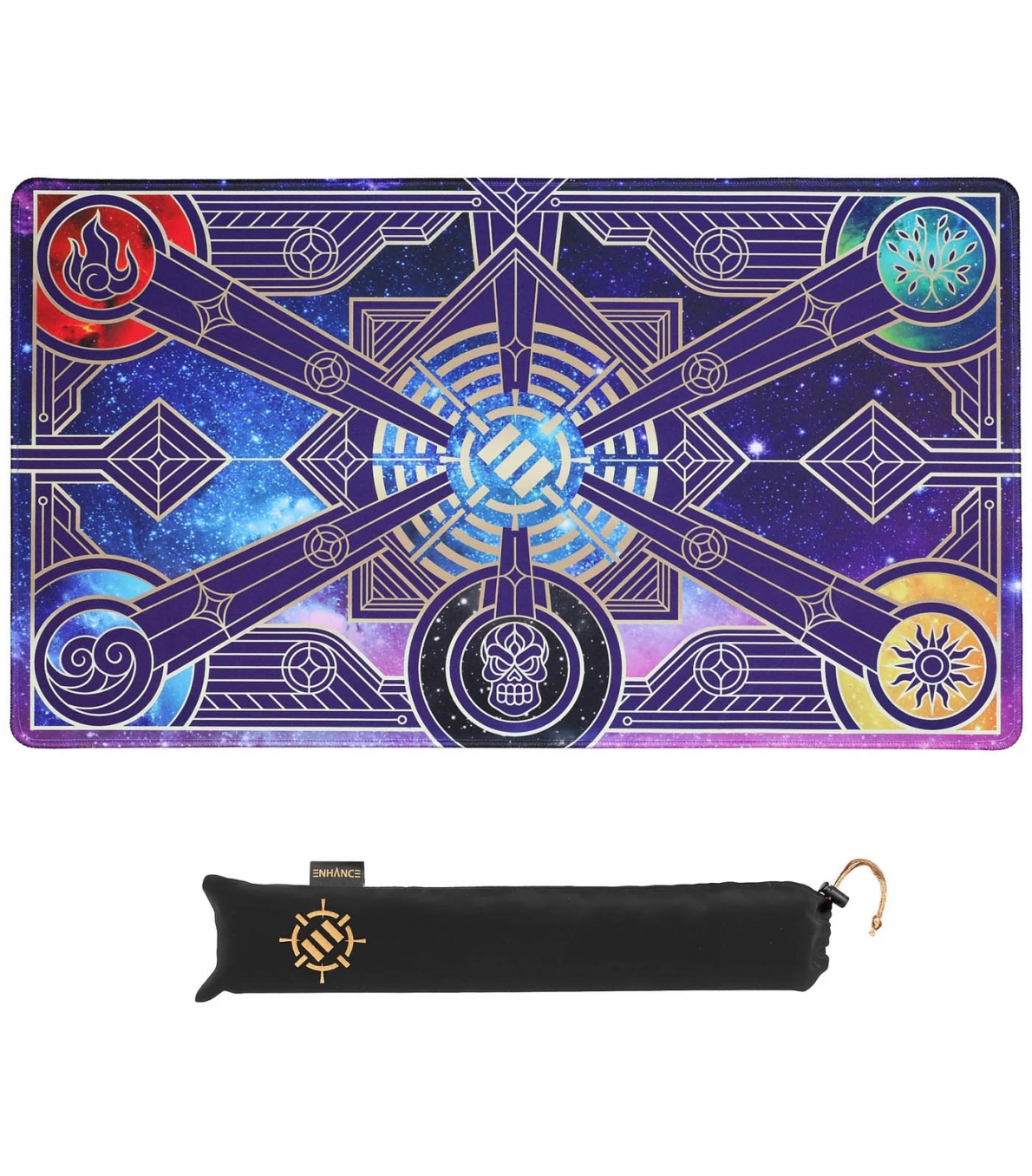 Tapete de juego para cartas 24″ × 14″, tejido ultrafino, dos diseños (Galaxy / Orange), bordes “Infinity Edge”, bolsa de transporte. Ideal para tiendas que ofertan accesorios de cartas coleccionables.
