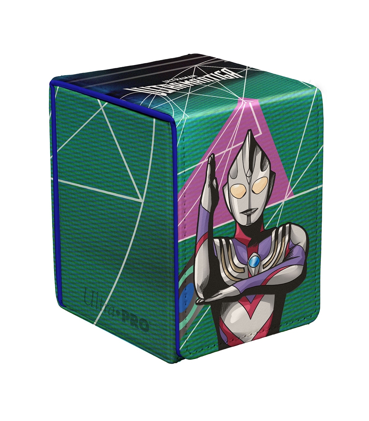 Caja DECK BOX® ALCOVE® Flip con licencia oficial ULTRAMAN TIGA para cartas de juego, diseño con artwork vibrante y acabado en cuero sintético, cierre magnético fuerte y solapas con muescas para facilitar el acceso a tu mazo. Capacidad para hasta 100 cartas tamaño estándar doblemente enfundadas en Ultra PRO DECK PROTECTOR®. Contenedor resistente ideal para exhibición, transporte y organización de mazos. Perfecto para distribución y venta al por mayor en tiendas de juegos y coleccionismo.