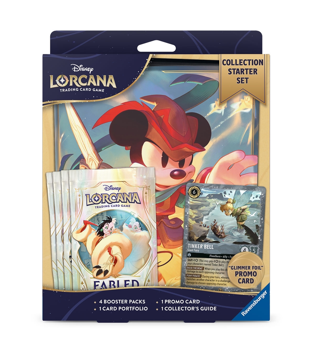 Set de colección ideal para nuevos jugadores y coleccionistas de Disney Lorcana TCG. Incluye 4 sobres de refuerzo de la expansión Fabled, un portafolio de 4 bolsillos para almacenar cartas, una carta promocional de Tinker Bell – Giant Fairy con acabado "Glimmer Foil" y una guía para coleccionistas. Producto en inglés, diseñado para distribución al por mayor en tiendas especializadas.