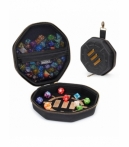 Estuche 2 en 1 para dados con carcasa rígida reforzada y cremallera de alta resistencia. Incluye bandeja desmontable con forro suave y paredes altas para lanzar dados sin que se salgan. Capacidad para almacenar más de 150 dados en compartimento forrado antiarañazos. Ideal para tiendas especializadas en juegos de mesa y rol. Diseño con herrajes metálicos en bronce envejecido y clip para acoplar a mochilas de la serie Tabletop. Venta al por mayor para distribuidores y puntos de venta.