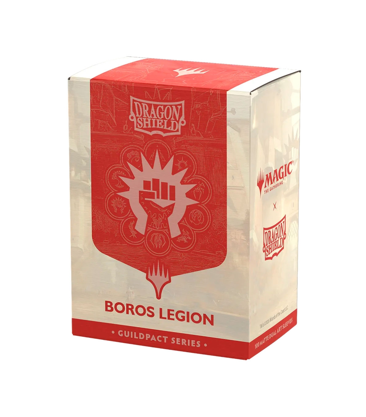 Fundas Dragon Shield Matte Dual Art Boros Legion (100 uds.). Compatibles con cartas estándar (hasta 63×88 mm). Diseño oficial de la guild Boros Legion con símbolo metálico y colores temáticos. Acabado Dual Matte para una mezcla ideal de estilo y funcionalidad. Distribución mayorista en caja reutilizable.