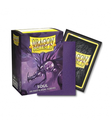 Fundas Standard Matte - 63mm x 88mm Metallic Purple / Soul de Sin Licencia - Dragon Shield Las fundas son completamente opacas por la parte trasera. Con un interior negro, haciendo que el arte de las cartas destaquen.