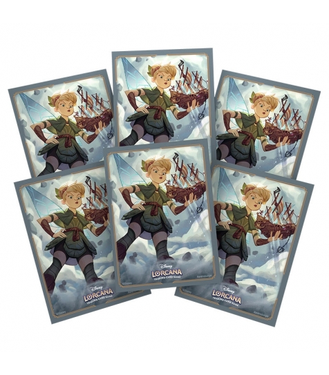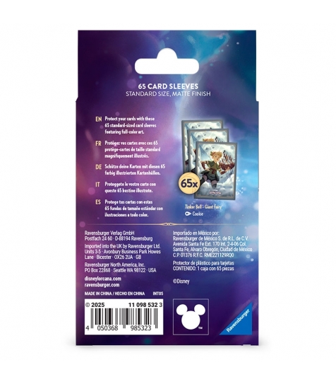 Fundas oficiales Disney Lorcana con ilustraciones de Mickey Mouse – Wayward Sorcerer y Tinker Bell – Giant Fairy (versión Encantada). Cada pack incluye 65 fundas con acabado mate, ideales para proteger cartas durante el juego.