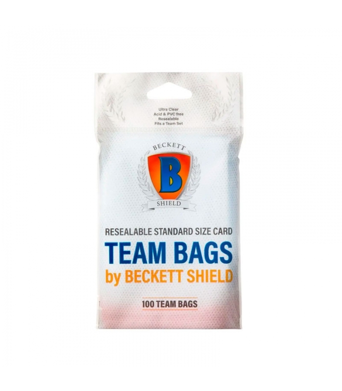 Las bolsas de equipo están diseñadas para almacenar hasta 35 tarjetas de tamaño estándar. Vienen en paquetes de 100. Las bolsas de equipo se pueden abrir y cerrar fácilmente con la tira resellable de 1" en la parte superior. La dimensión de la funda exterior es de 3-3/8" x 5" (88,7 mm x 127 mm). Material de PP. Sin PVC. No hay colección sin protección: defiende tu colección con Beckett Shield y mantén tus tarjetas en perfecto estado.